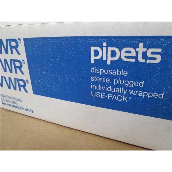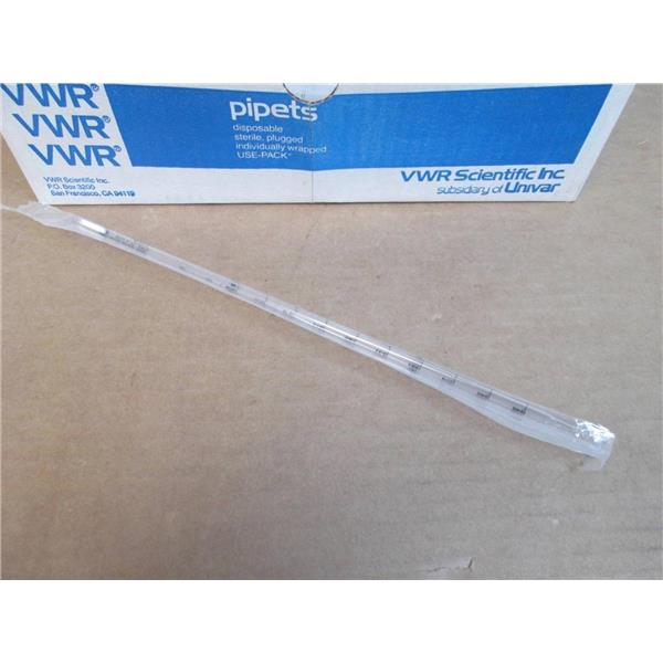 - Description: 1 x 1/10 mL Serological Disposable Pipet; sterile; plugged; individually wrapped; borosilicate glass; box of 175; original packaging but the box has shelf wear and some moisture marks.