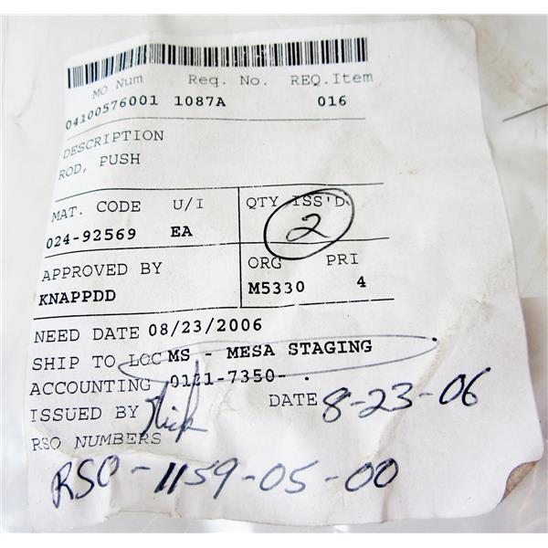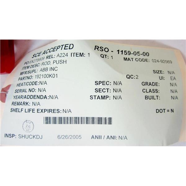 ABB 192100K01 PUSH ROD, CONTROL DEVICE FOR SWITGEAR EQUIPMENT - NEW