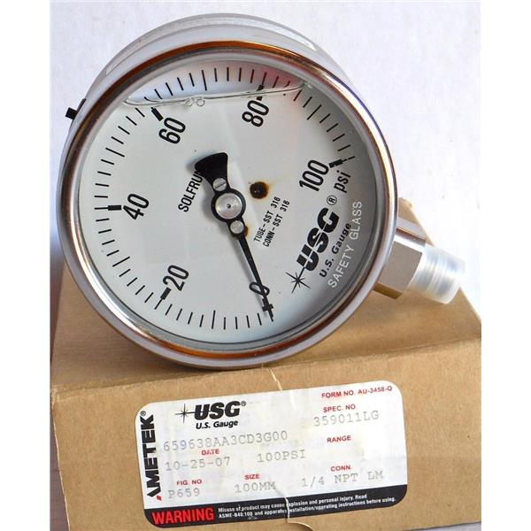 AMETEK / USG 659638AA3CD3G00 SOLFRUNT LIQUID FILLED PRESSURE GAUGE GUAGE GAGE, 0-100PSI 100 PSI, 1/4" NPT LM, 100mm FACE NEW
