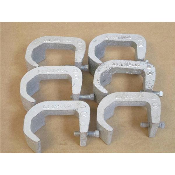 - Description: 1 1/4"-1 1/2" Adjustable Beam Clamp; lot of 6; minor shelf wear; missing some original packaging; new and unused.