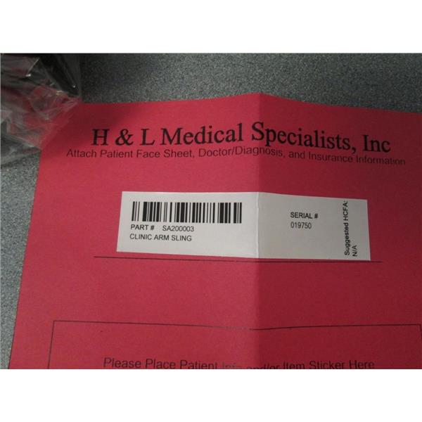 Clinic Arm Sling Suggested HCFA Code: A4565 Indications Immobilizes and supports mild sprains and strains of the shoulder or fractures of the arm. Description - Five sizes for better fit - Over-sized envelop accommodates large casts & dressings - Thumb loop keeps the sling in position - Customized fitting & adjustment features on front & back for perfect fit - Padded strap with easy touch closure - Latex Free roduct Number