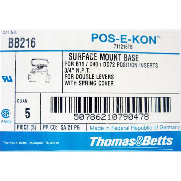 - Description: Rectangular Insert Bases: Type - Surface Mount Base; Attachment Type - Double Post; Cover Provision - With Cover; Entry Position (Quantity) - Side (1); Entry Size - 0.75 in NPT; Mounts To - Double Lever Hood; Mounting Code-Series Size - B16, C6, D40, DD72, M5; Material, Housing - Die Cast Aluminum; Enclosure Rating - IP65; Manufacturer Series - Pos-E-Kon (TM)