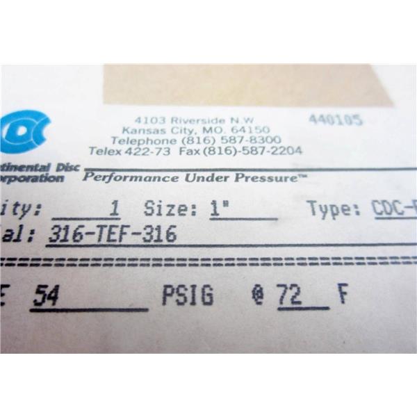 Continental Disc Corp. 1" 179963 Rupture Disc 54 PSIG @ 72° F CDC-R 316-TEF-316.