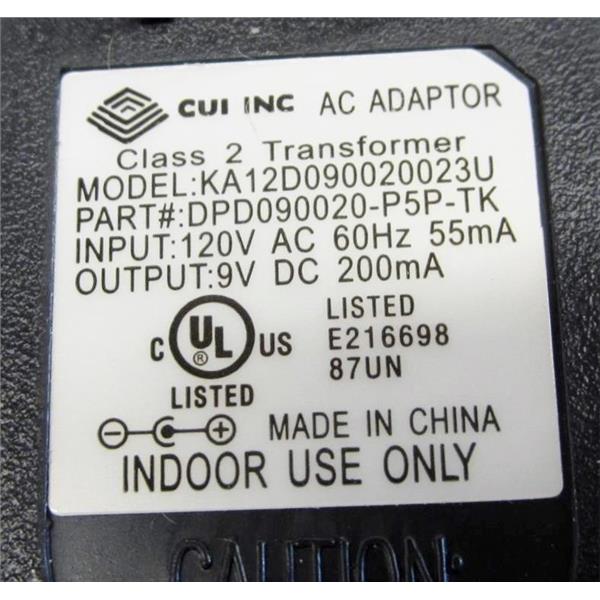 - Description: New in box; AC Adapter, class 2 transformer.; Part No: DPD090020-P5P-TK; Input: 120V AC 60Hz 55mA; Output: 9V DC 200mA.