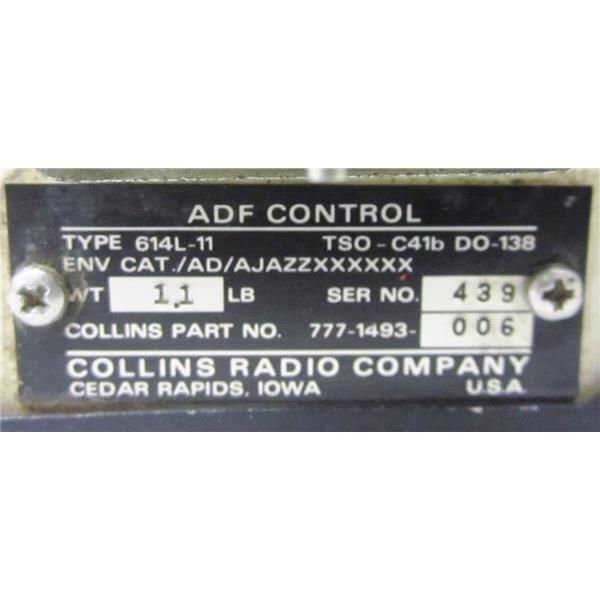 You're reviewing: COLLINS 777-1493-006 ADF CONTROL TYPE 614L-11 Tagged "Repairable"