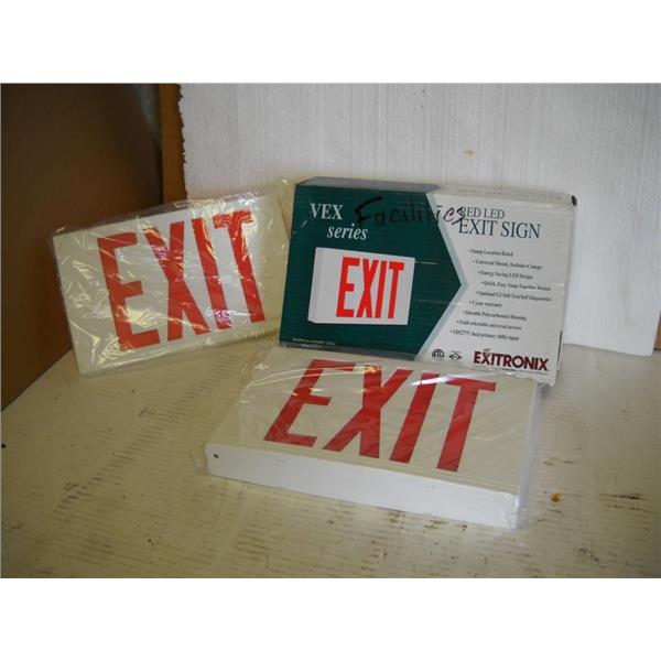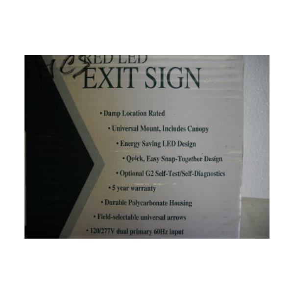 These signs were purchased from a business liquidation sale. They appear to be new in the box. The label reads Plastic, LED exit sign, 120/277 VAC, universal, battery backup, W/canapy, red letters, white housing, catalog number VEX/U/BP/WB/WH. The dimensions are about 12" x 7-1/2" x 1-3/4". I did not unpackage these and did not test them.