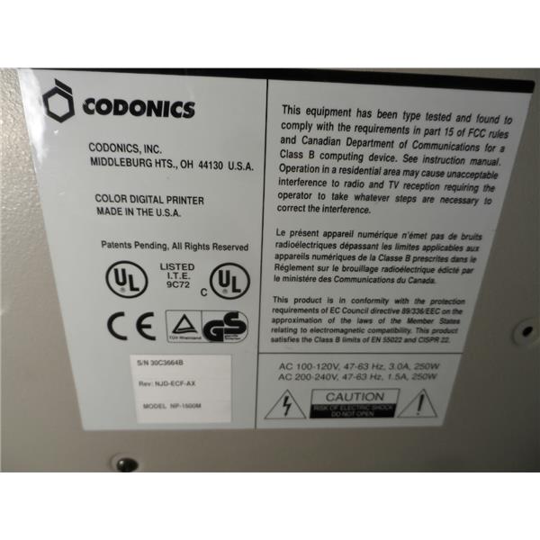 | Condition Description | This item was purchased from a large business inventory reduction sale. I do not know the history of it. The back has a label that reads, "Codonics color digital printer model NP-1600M". It is used with normal wear. It powers on, the fan runs, and it goes through initialization. The screen read, "head preheating", "booting", and then "ready". It is difficult to latch the top cover down and it has a small screw attachment point under the lid that is broken (see last picture). The small screw is one of the screws that holds the carriage assembly to the cover. I am not able to test it further. It only comes with what is shown in the pictures. |
