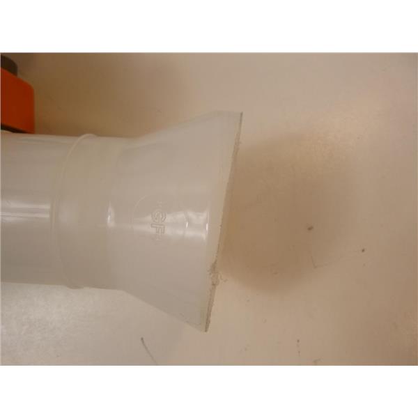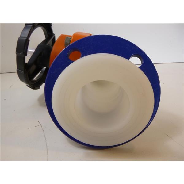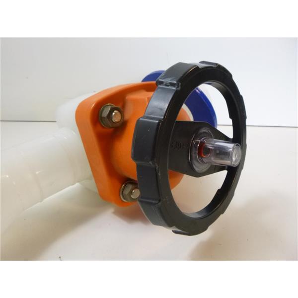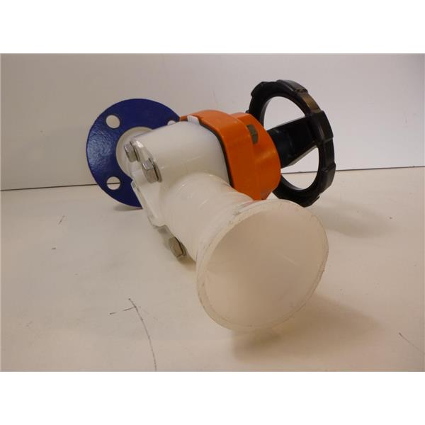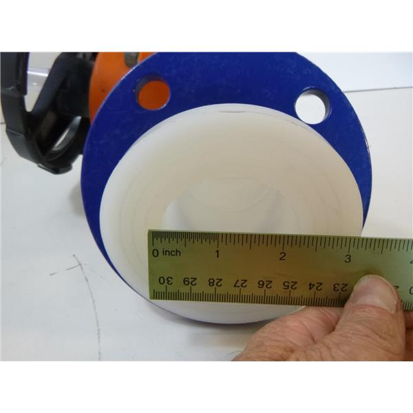 Used in good condition. This was taken from a clean water purification system. I am not sure of the specs on this but the inside diameter of the pipe looks to me to be 2-3/16". The blue flange looks to me to be about 6-1/4" in diameter. The valve opens and closes fine. The side opposite of the one that has the blue flange has been cut an an angle and so that side would likely need to be re-cut to use.