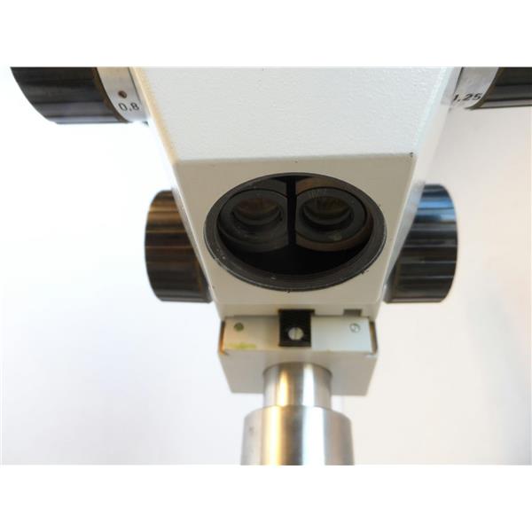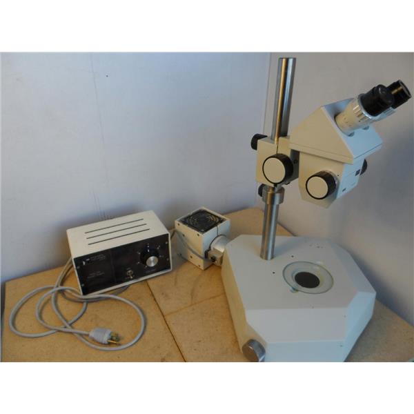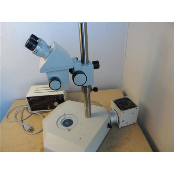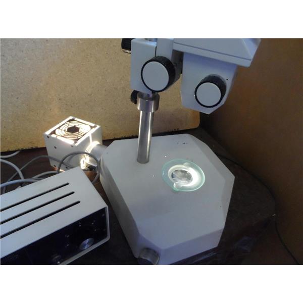 Used but in good condition. I do not see any part number or model number on this unit. The light turns on and I can adjust the intensity with the Diagnostic Instruments brand light source controller that is included. The eyepieces are GF/Pw 12.5X (20). I can see through the optics just fine. It does not have any type of objective(s) on it. The two outer knobs on the head feel like they need some type of adjustment because they don't really turn smoothly/evenly. I am not able to test it further. It only comes with what is shown in the pictures.
