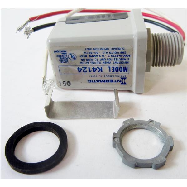 - Description: K4124 208V Photocontrol; Thermal; 208 Vac Voltage Rating; 3100 W Tungsten Load; 1700 Va Ballast Load; 1 to 5 FC Turn On Light Level; 3 to 15 FC Turn Off Light Level; 6 Inch Wire Lead Terminal; Temperature Rating -40 to 158 Deg F; 1/2 Inch-14 Tpi Stem Mounting