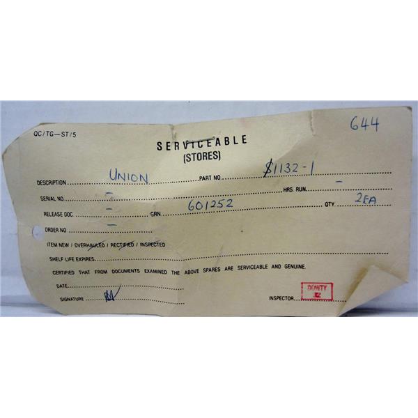 *LOT OF 2* S1132-1 UNIONS, AVIATION AIRCRAFT AIRPLANE SPARE SURPLUS PART