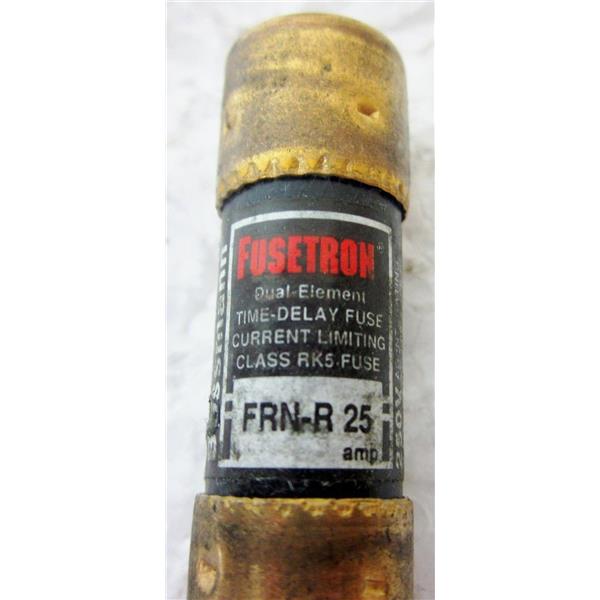 - Description: Fusetron Fuses; FRN-R-25 Bussmann Fusetron Fuse 25 Amp 250 Volt Dual-Element Time Delay Current Limiting UL Class RK5 Fuse 200kA Interrupting Rating; 1 Lot of 9 Units