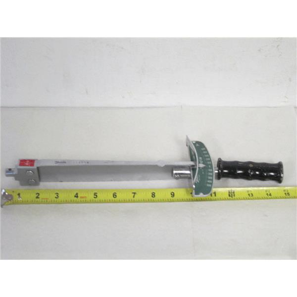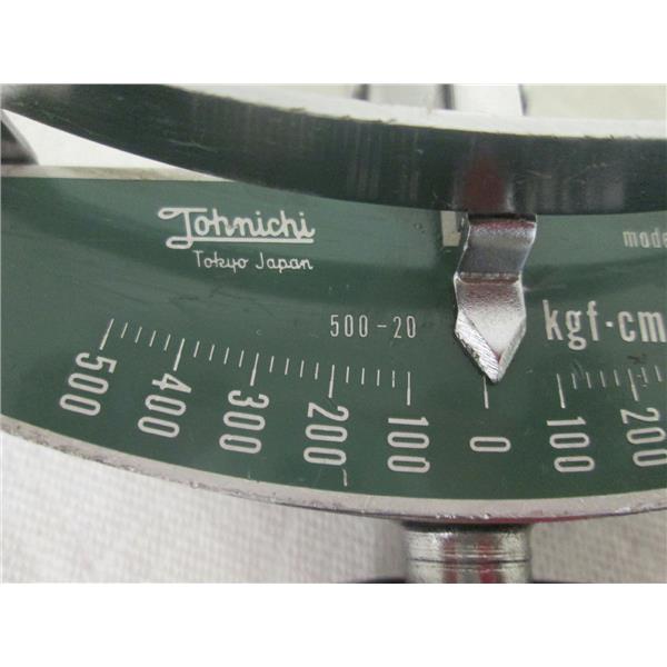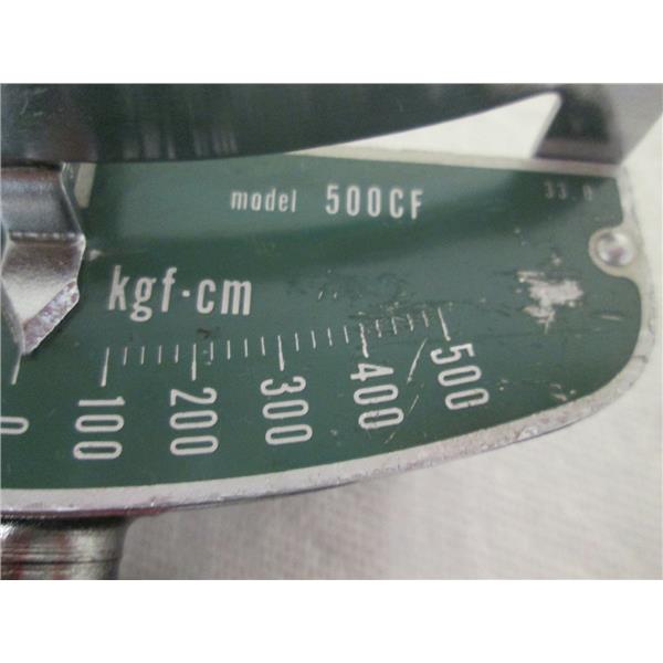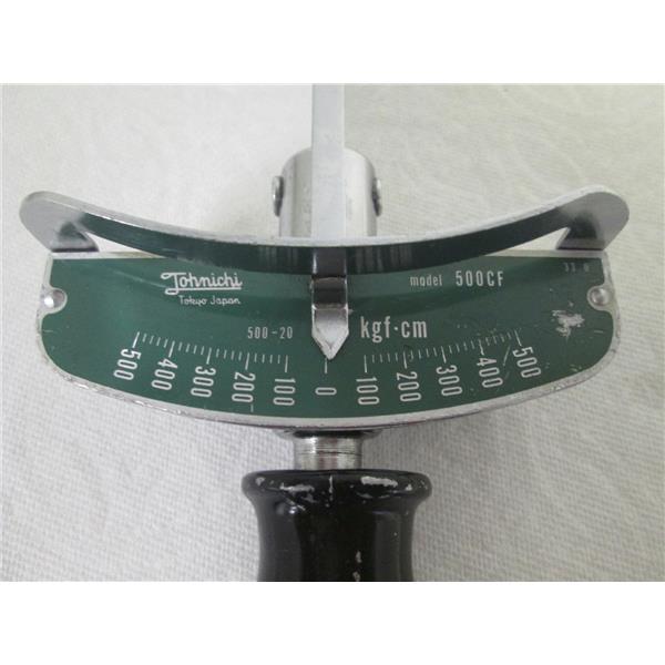 This listing is for an interchangeable head beam type torque wrench w/scale plate; BRAND/NAME: Tonichi; MODEL/PART #: 500CF; DESCRIPTION: Interchangeable Head Beam Type Torque Wrench w/Scale Plate, 100 to 500 kfg.cm torque range, 20 kfg.cm graduation, +/- 3% accuracy, calibration check recommended, for measuring and tightening applications, interchangeable head version of SF/F series, used but appears to be in very good condition, more than one identical item with slightly different cosmetic condition (black handle worn off), may not get one pictured.