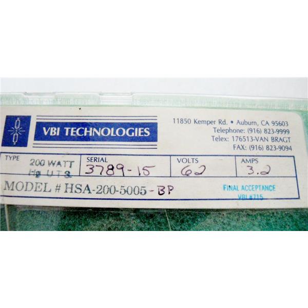 VBI TECHNOLOGIES HSA-200-5005-BP MERCURY LAMP, Hg UTS, 200W 62V 3.2A, 200 WATTS 62 VOLTS 3.2 AMPS - NEW/SURPLUS w/GUARANTEE